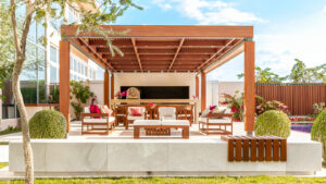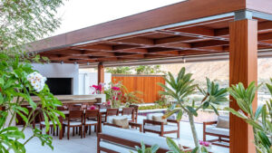 يتوسط المشروع عريشة طولها تسعة أمتار، وهي بمثابة حل لتوفير الظل للعائلة والضيوف دون إعاقة المنظر البانورامي للجبال.