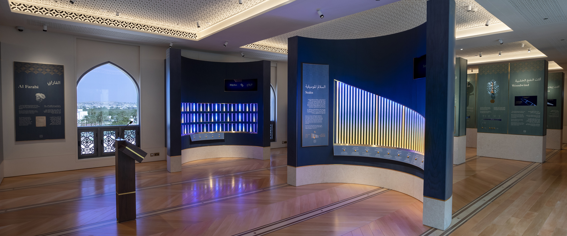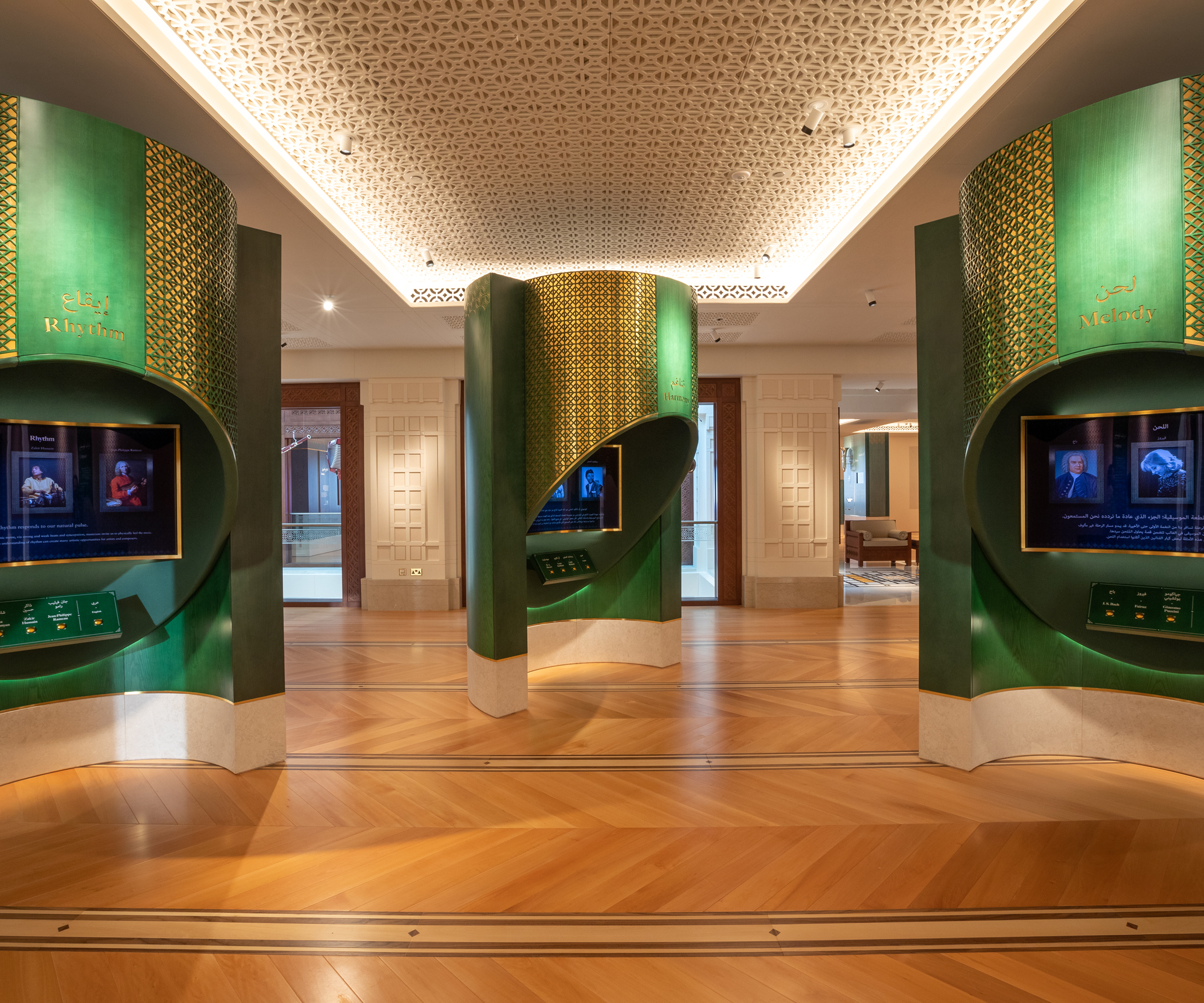 وكجزء من تجربة المتحف الآسرة، تعمل هذه القطع المصممة بدقة متناهية كعناصر أساسية ونقاط محورية فنية. كما أنها توفر خلفية متناغمة لاستكشاف الأصوات والموسيقى الغنية من عُمان ومن كافة أنحاء العالم، حيث تقود المشاهد في رحلة ساحرة عبر النسيج الثقافي العالمي.